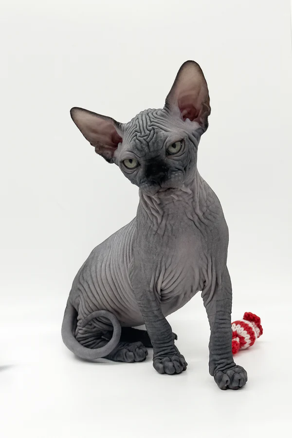 Hallo, ich bin Quantum. Ich bin ein kanadischer Sphynx-Kater mit warmem, schwarzem Fell, das von einem kleinen weißen Fleck geziert wird, und klaren, grünen Augen, die die Menschen, denen ich vertraue, direkt ansehen. Ich habe zwar kein Fell, aber dafür umso mehr Ausstrahlung – ich bin sanft, ruhig und sehr anhänglich. Meine Haut ist weich und warm, und ich suche von Natur aus die Nähe, sei es, indem ich mich neben dich kuschele oder ruhig in deinen Armen ruhe. Ich bekomme Purina Pro Plan Adult Derma Care zusammen mit rohem, gefrorenem Fleisch, was meine Hautgesundheit, meine Verdauung und meinen hohen Stoffwechsel unterstützt.
